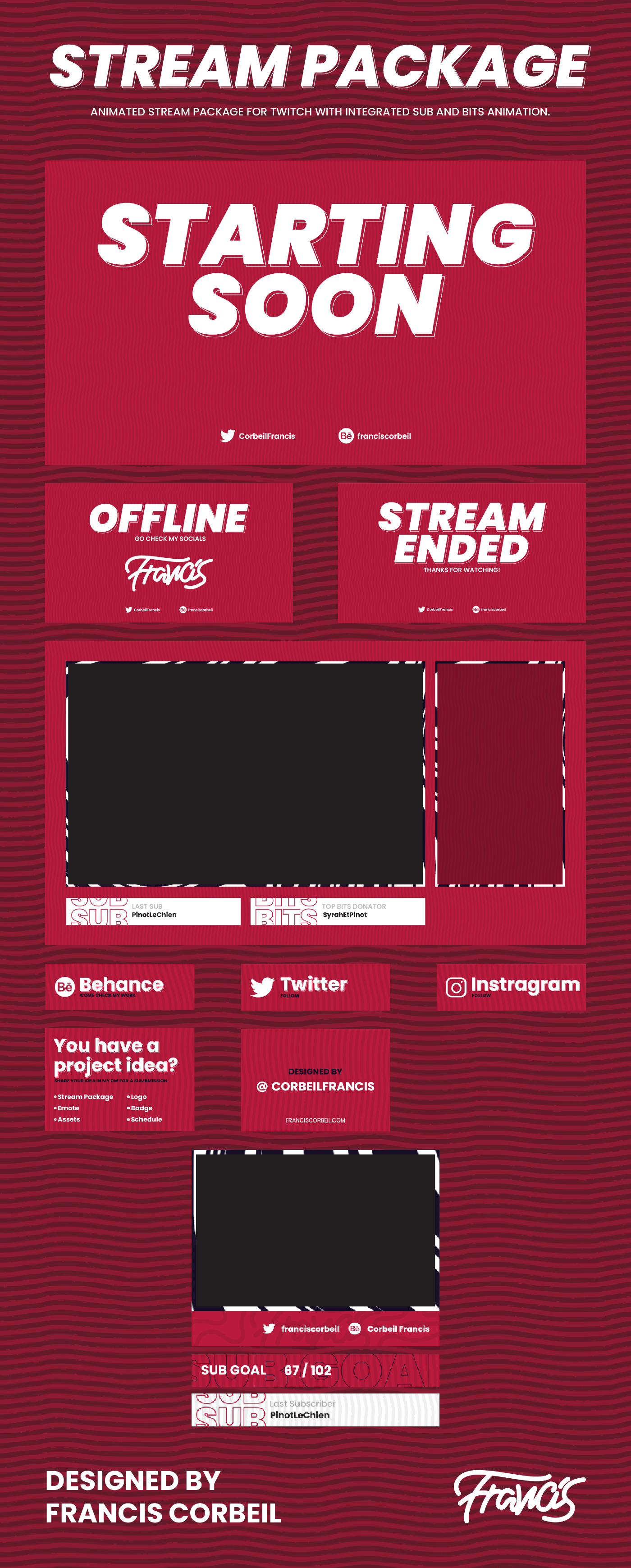 La couleur rouge dominante de l'arrière-plan, tout en étant une teinte puissante, est également personnalisable, permettant aux streamers de l'ajuster selon leurs préférences et leur branding. L'ajout sporadique de contours de vague bleue dans certaines sections de l'overlay injecte une dose de dynamisme et de fluidité à la scène, créant un contraste visuel intéressant. En somme, ce projet d'Overlay de Stream offre un équilibre parfait entre l'élégance et la personnalisation, permettant aux streamers de se démarquer tout en offrant une expérience visuelle agréable à leur audience.